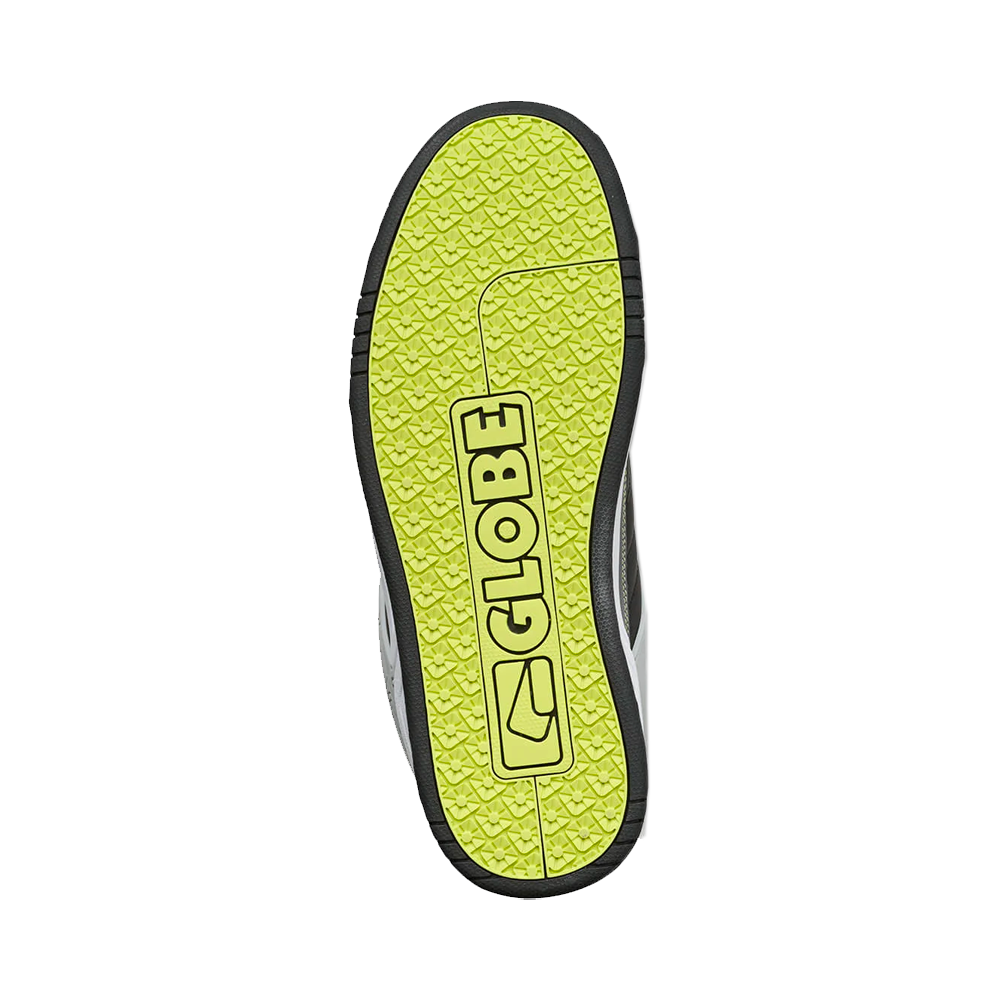 Globe skateboard classica silhouette heritage. Come parte della serie Upcycled Heritage, presenta una fodera in rete di poliestere riciclato, una resistente rete ripstop e una tomaia in pelle sintetica. Questo modello presenta anche una suola a coppa in gomma parzialmente riciclata, utilizzando scarti di gomma provenienti dal pavimento della fabbrica, che altrimenti verrebbero buttati via.