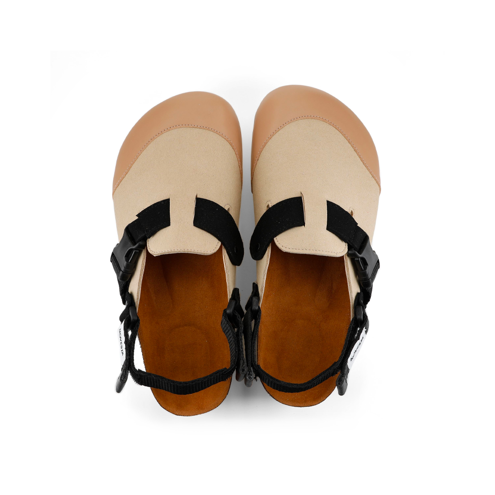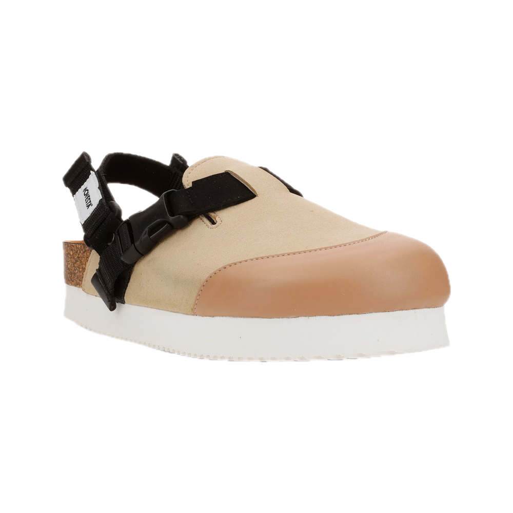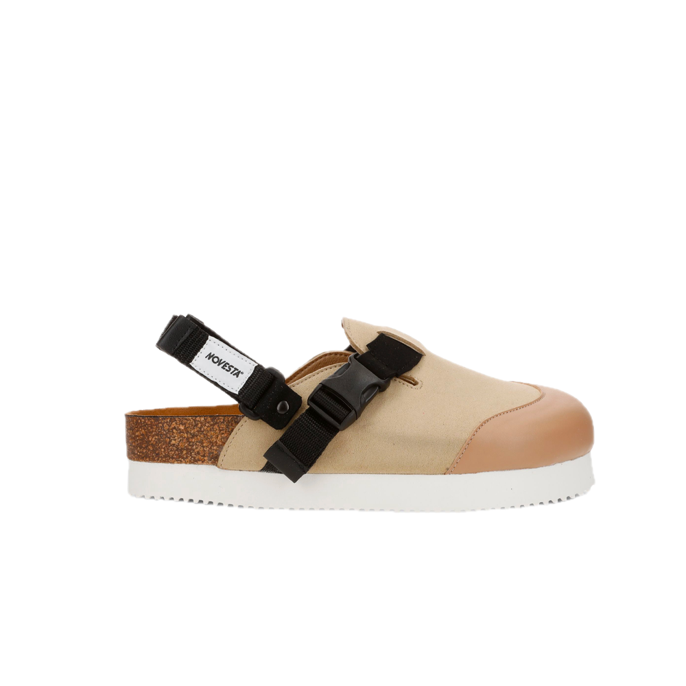 The Novesta “Tatra” is the modern reinterpretation of the classic mountain clog, proposed in a refined urban version with technical details. The upper is made of natural beige canvas with a tone-on-tone leather tip, while the interior is lined in leather for comfort and breathability. The adjustable nylon back strap, with a mountaineering-style buckle closure, ensures a stable and adjustable fit, making the model suitable for both indoor and outdoor use. The sole is in EVA rubber with a natural cork insert, which guarantees lightness and cushioning. Versatile and original, it is the perfect choice for those looking for a sophisticated alternative to the classic summer slipper.
