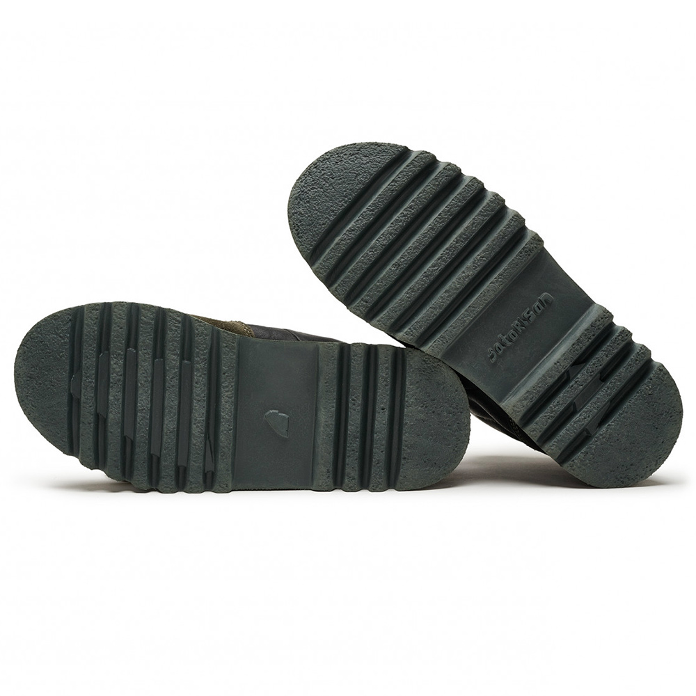 Etichetta in pelle cucita a mano sulla linguetta con logo Satorisan in rilievo a caldo.