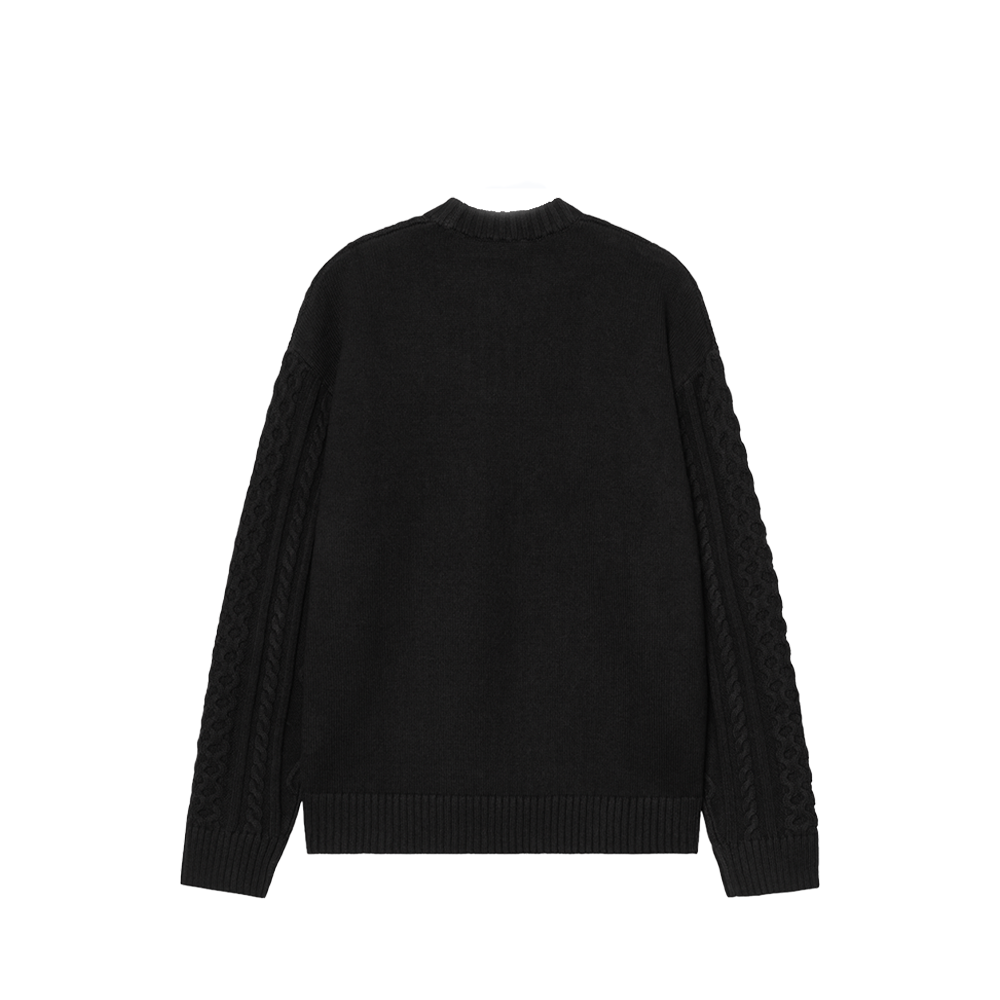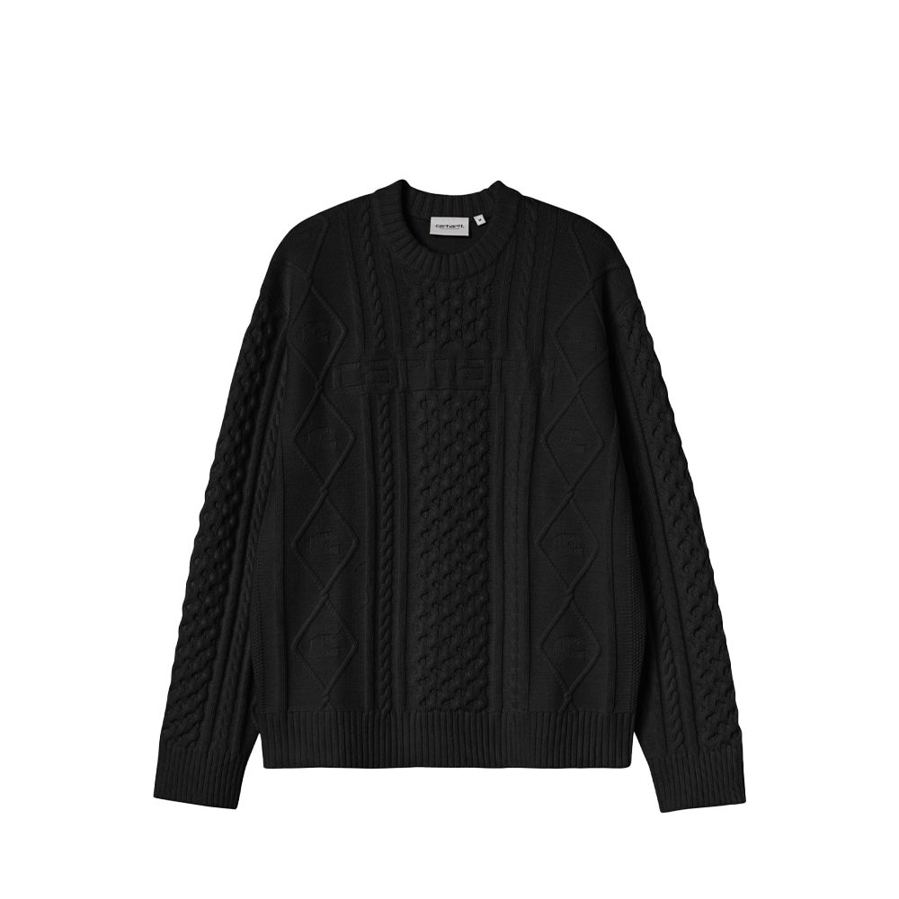 The Carhartt WIP Shawn sweater is made from a heavy cotton and acrylic blend. It features a cable-knit pattern on the front and sleeves. The Script logo is embossed on the chest.