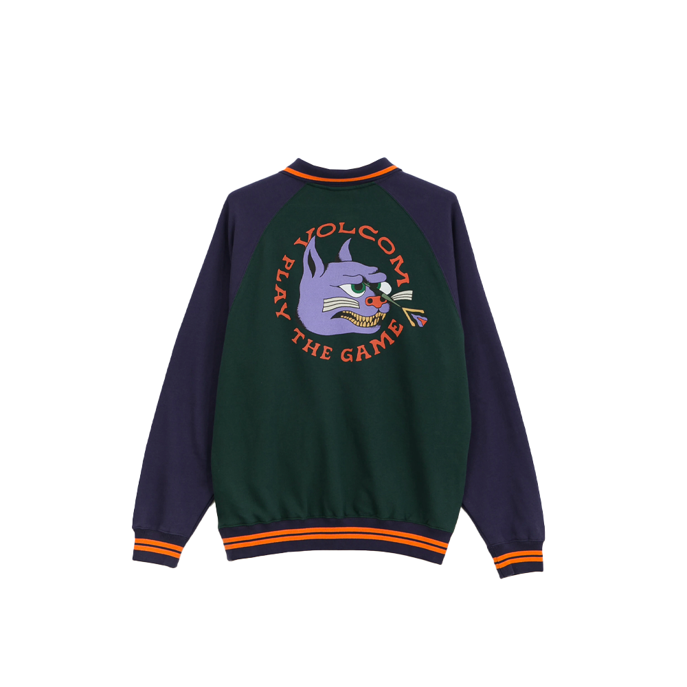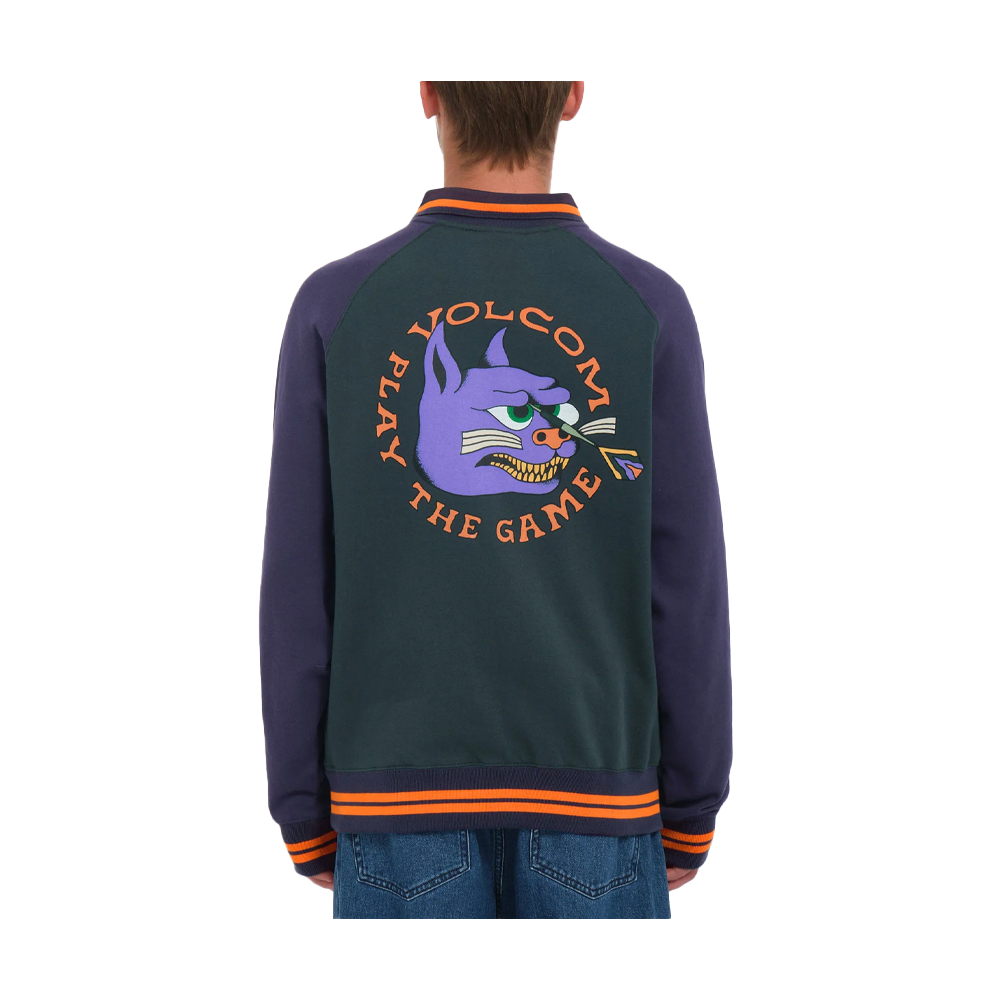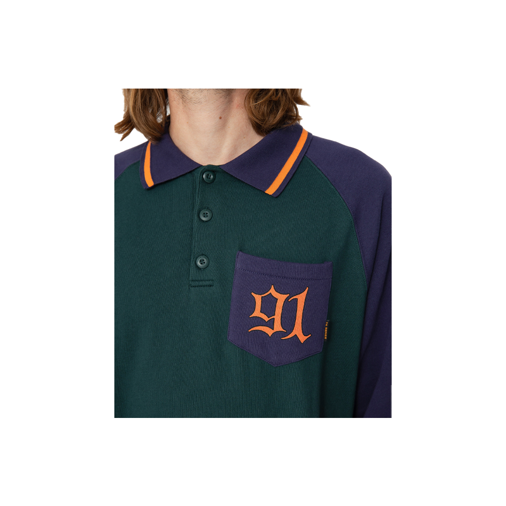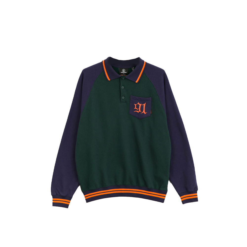 The Volcom Nando Von Arb Sweatshirt in Ponderosa Pine is a versatile men’s fleece sweatshirt in a regular fit. With a polo collar and raglan sleeves, this sweatshirt offers a comfortable fit. It weighs 290g and has a front chest pocket. The sweatshirt features screenprints on the front and back with unique artwork by featured artist Nando Von Arb. Button fastening at the neck, jacquard ribbing and a woven label at the side seams add further style. The artist’s signature in the foreground is present inside the neckline. Made with at least 20% Repreve™ recycled polyester.