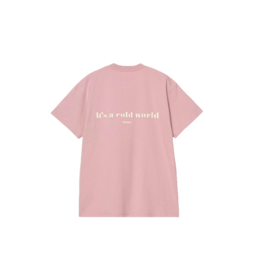 The Carhartt Wip Cold World S/S T-shirt is made of medium-weight cotton jersey and features a loose fit, relaxed shoulders, and a slightly longer hem. The style is garment-dyed, giving it a washed-out yet saturated hue. A square woven label, rendered opaque by the garment-dyeing process, is featured on the left chest.