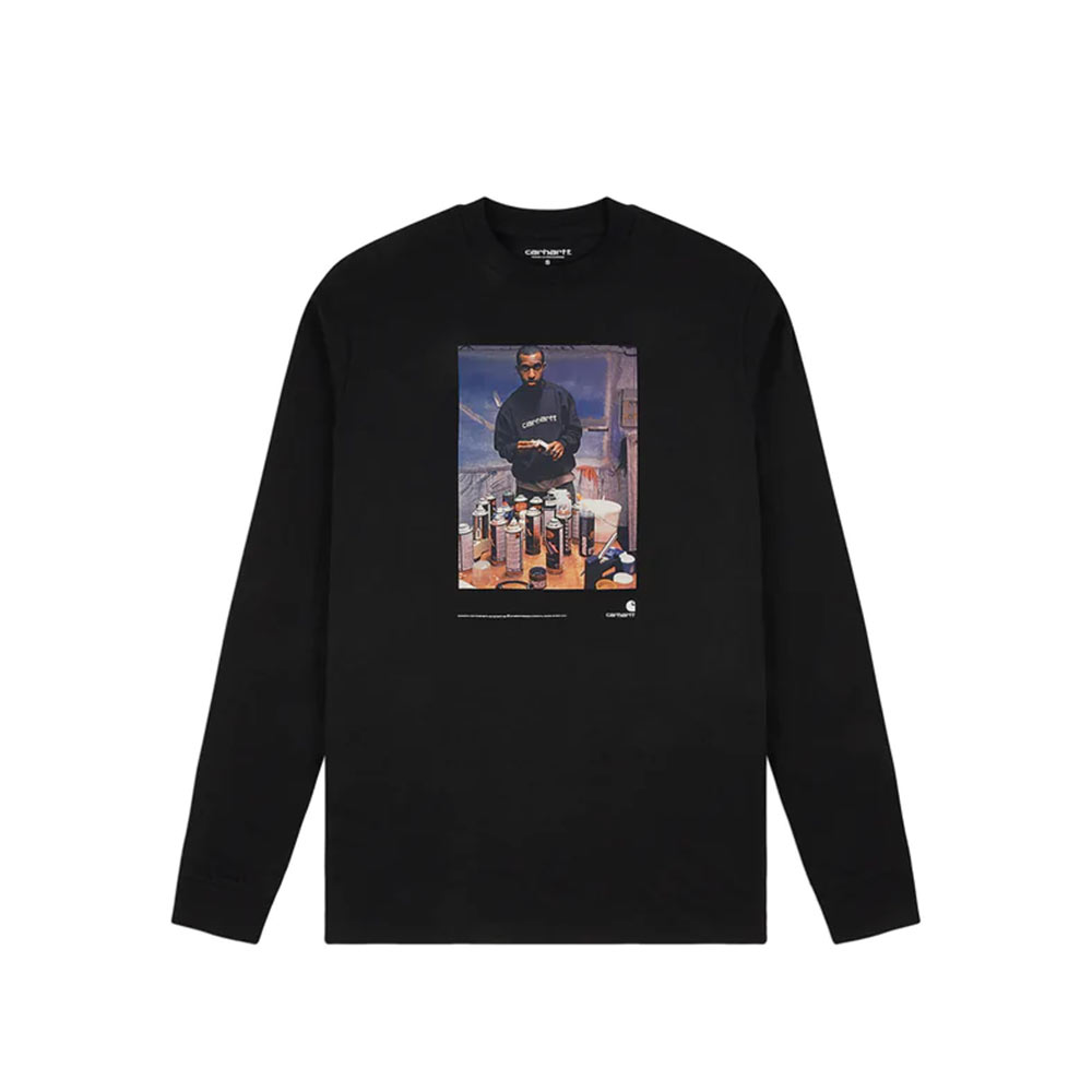 Carhartt long-sleeved T-shirt with front print dedicated to the artist Jay One, also known as the pioneer of graffiti in Paris and Europe. The garment is total black in the back.