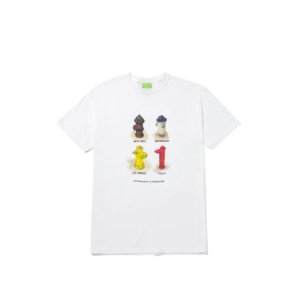 The HUF All Cities short-sleeved T-shirt is made of pure cotton and features hand-illustrated fire hydrants of HUF’s favorite cities printed on the front.
