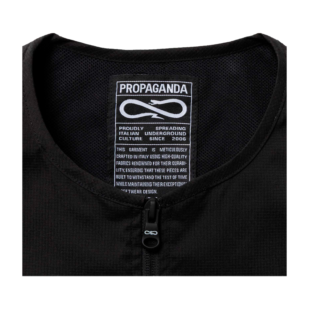 The Propaganda Logo Atom Vest is a sleeveless vest made from durable ripstop polyester, perfect for an urban and contemporary look. It features a vertical zip front closure, a silicone patch applied to the chest and a transfer screen print on the back that recalls the brand identity. Two practical front pockets complete the design, ideal for keeping essentials close at hand.