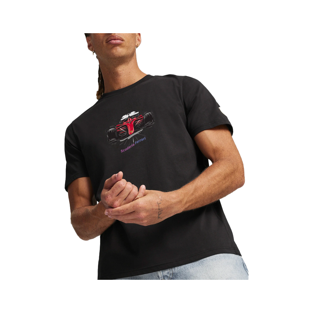Show your love for Scuderia Ferrari with this racing-inspired graphic tee. The regular fit men’s t-shirt features the Scuderia Ferrari graphic print on the chest, the shield on the right arm and the PUMA Cat logo on the back. He’s sure to turn heads wherever you wear him… Made with at least 20% recycled cotton.