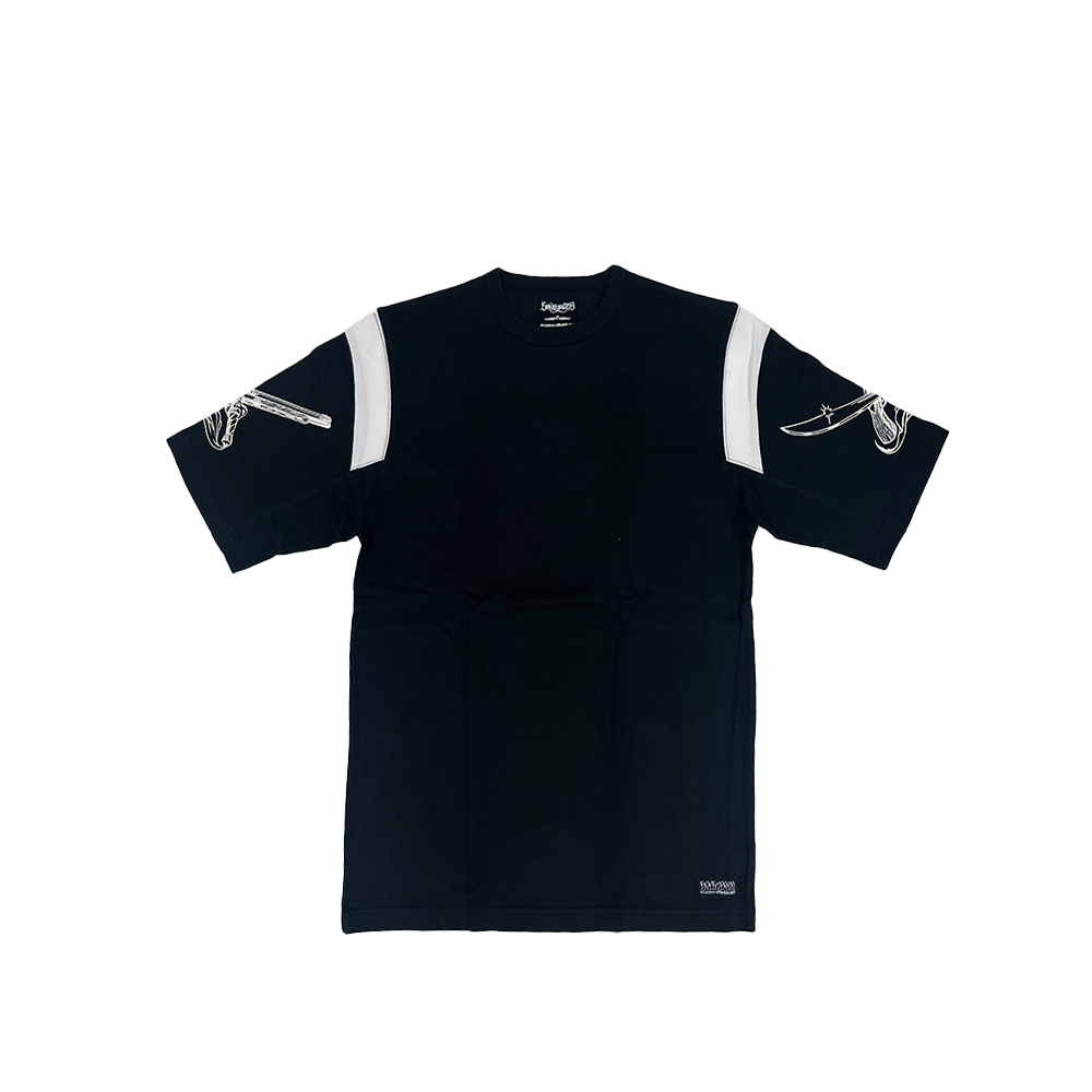 T-shirt born from the historic collaboration between Neighborhood x Stussy, part of the iconic Boneyards collection of 2008. The model features a black base with white contrasting graphics on the sleeves, depicting a crossed knife and gun, symbolizing rebellion and underground culture. The back features the Chicano-style “Boneyards” lettering, a reference to the Californian lowrider and biker movement. Made of high-quality cotton, it has a regular fit and refined details such as the white contrasting stitching on the shoulders. Internal label and lower label with shared branding.