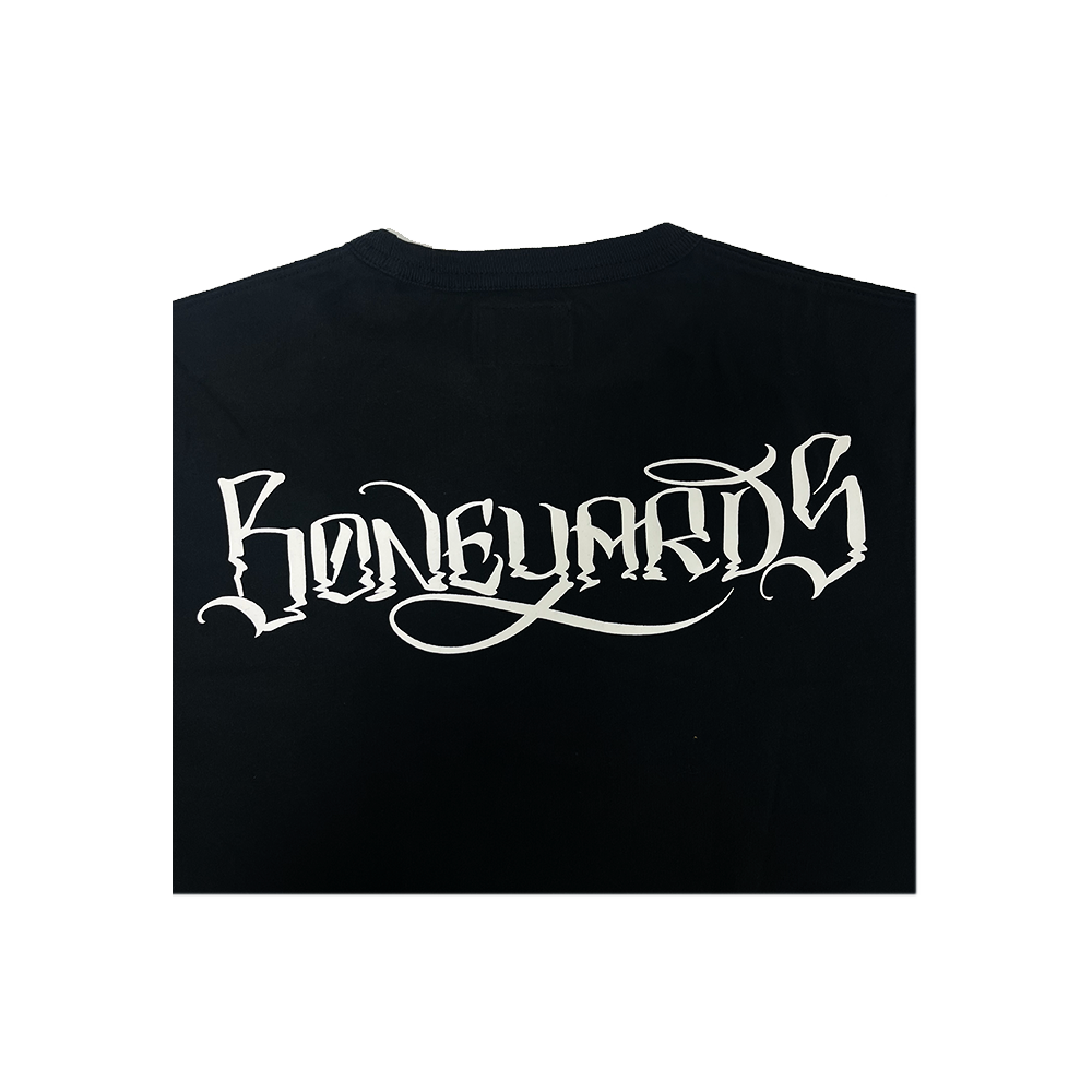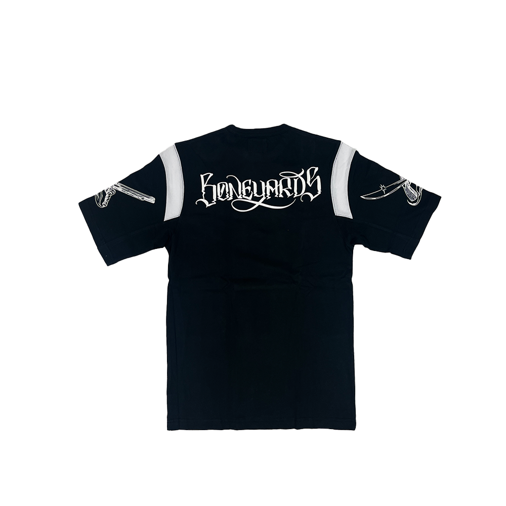 T-shirt nata dalla storica collaborazione tra Neighborhood x Stussy, parte dell’iconica collezione Boneyards del 2008. Il modello presenta una base nera con grafica a contrasto bianca sulle maniche, che raffigurano un coltello e una pistola incrociati, a simboleggiare ribellione e cultura underground. Sul retro domina il lettering “Boneyards” in stile chicano, richiamo al movimento lowrider e biker californiano. Realizzata in cotone di alta qualità, presenta un fit regolare e dettagli curati come le cuciture a contrasto bianche sulle spalle. Etichetta interna e label inferiore con branding condiviso.