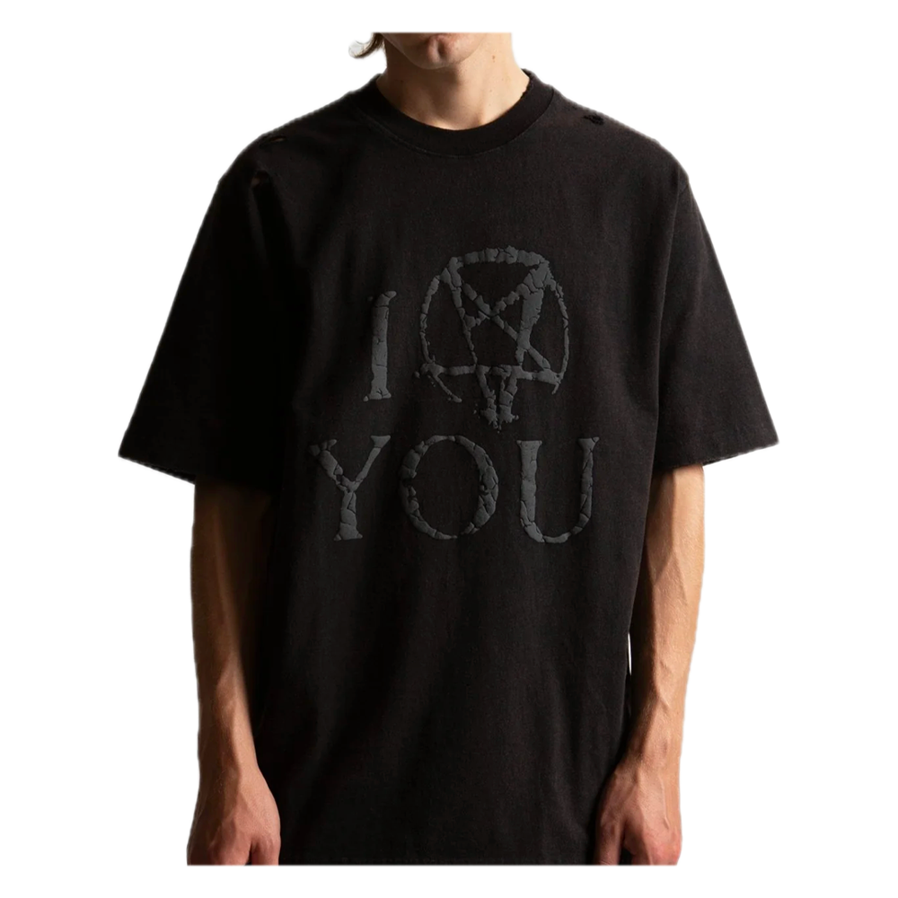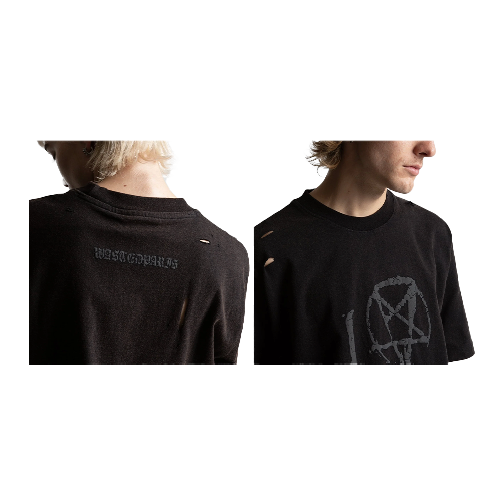 The Wasted Paris Curse is made of 215g destroyed-effect cotton with perforated details. It features a raised, cracked image of Curse on the front and “Wasted Paris” lettering on the upper back.