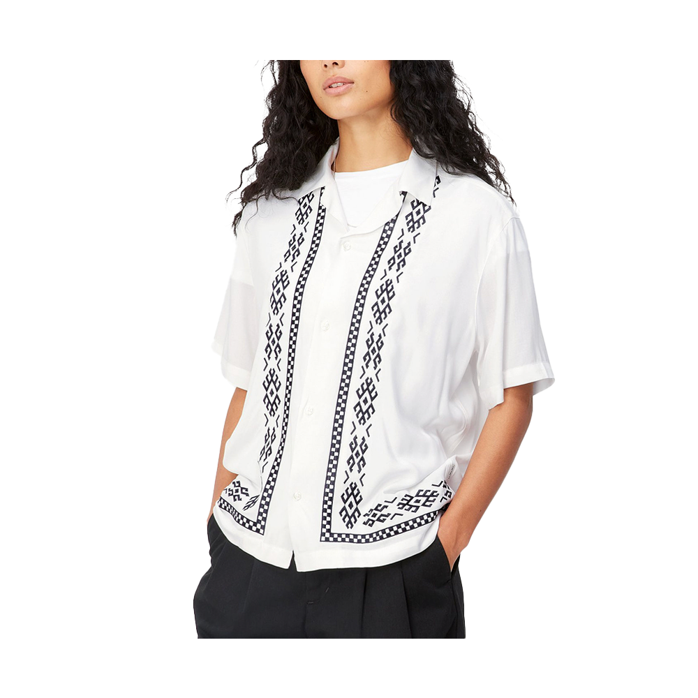 The Carhartt WIP Women’s S/S Coba Shirt is woven from fluid, sustainably-sourced viscose fabric. It features a buttoned front and camp collar, and is detailed with ornate embroidery throughout.