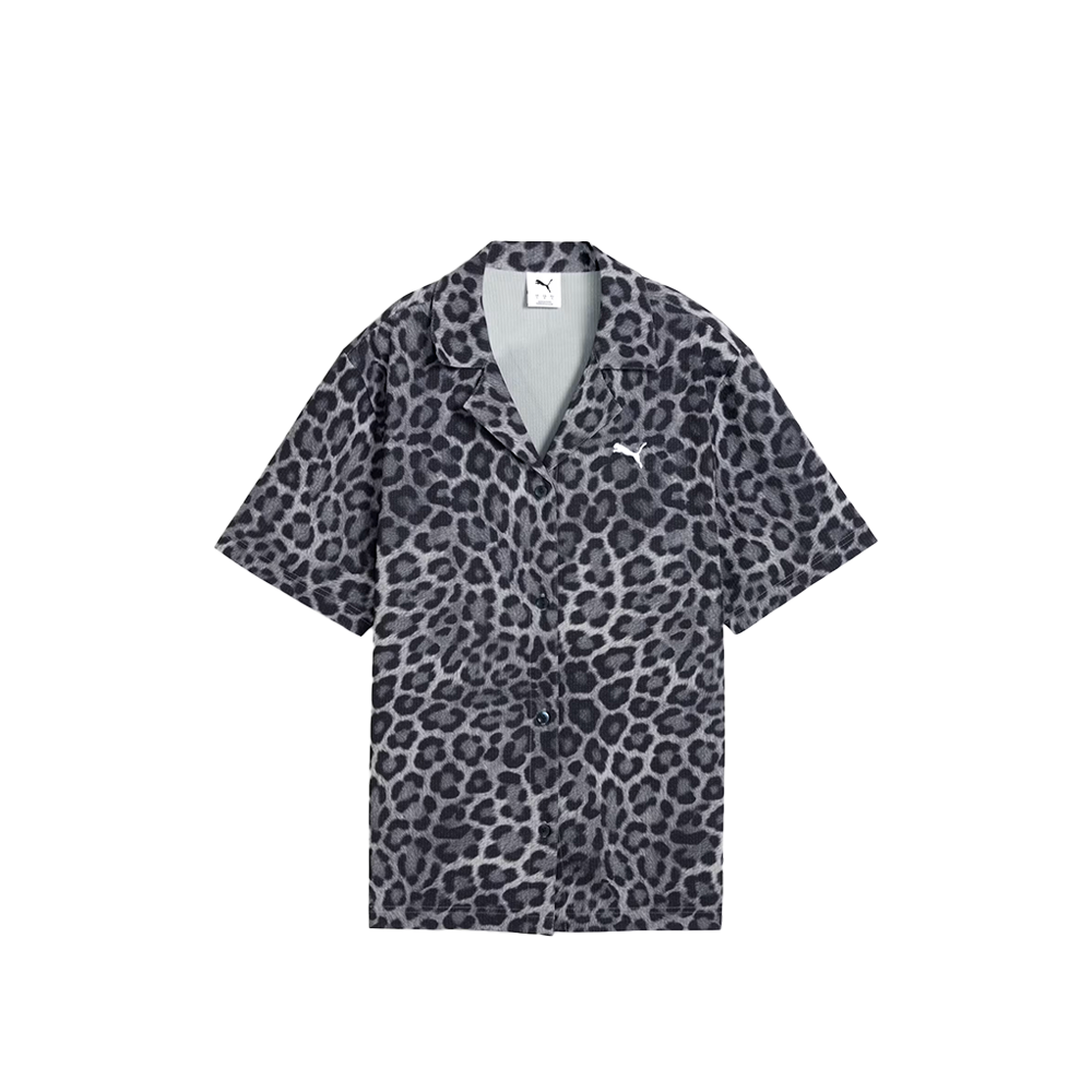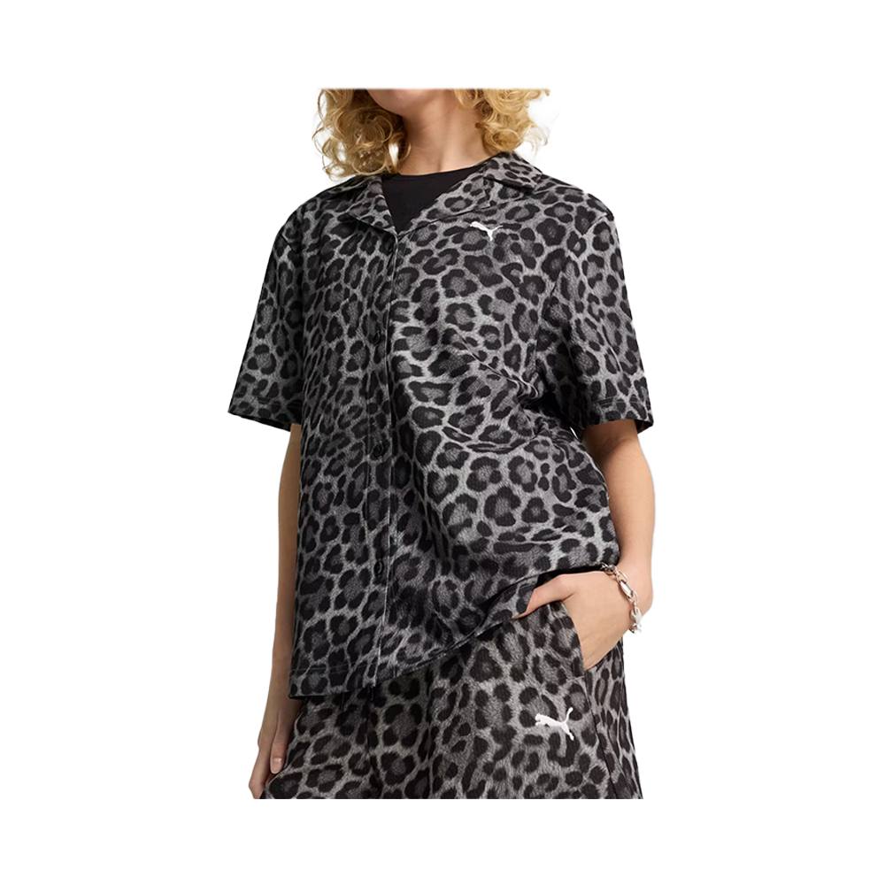 Unleash your wild side in this relaxed fit shirt featuring an all-over leopard print and a sleek PUMA Cat Logo embroidery. Perfect for making a statement, this Puma piece brings bold energy to any outfit.